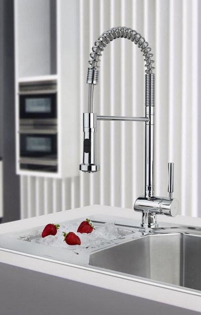 Для использования режима душа смесители оснащаются, как правило, выдвижным изливом, который имеет насадку-душ. В конструкцию у них добавляется элемент, который способен переключать направление струи с обычного излива на гибкий. Отдельный гибкий шланг вытягивается наружу за эту насадку из корпуса излива. Длина его может составить до 1,5 м, что поможет также вымыть все уголки раковины и наполнить емкости любого размера. Кроме смесителей с одним выдвижным изливом , производители предлагают полупрофессиональные модели с двумя изливами.