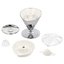 Два конуса различаются размером — можно выбрать подходящий под фрукты. Металлический фильтр надежно задерживает мякоть, в резервуаре остается чистый сок. Защитная крышка поможет уберечься от брызг при работе устройства. Мощность 80 Вт позволит отжать сок за считанные минуты: достаточно разрезать апельсин, грейпфрут или гранат пополам и надеть его на конус. Включение производится при помощи кнопки на корпусе. После того как фрукт снят с конуса, работа останавливается автоматически. Большинство деталей, включая конусы и фильтр, можно мыть в посудомоечной машине. Предусмотрено также автоматическое отключение при перегрузке или перегреве.