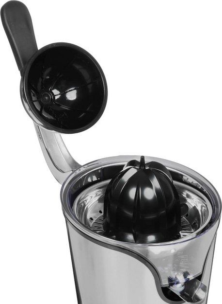 Соковыжималка для цитрусовых позволяет получить сок из лимонов, лаймов, апельсинов. Их достаточно разрезать пополам, поместить разрезом вниз на ребристый конус-наконечник и удерживать вручную или с помощью пресса. При включении прибора конус вращается, сок отжимается и стекает в контейнер.