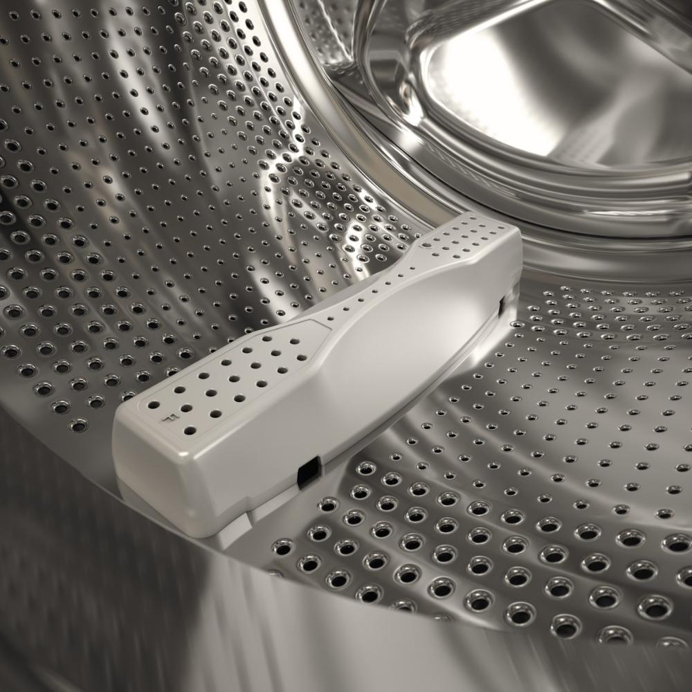 Материалы: бак и сам барабан выполнены из нержавеющей стали — это классический выбор для долговечной рабочей камеры, устойчивой к влажной среде и механическим нагрузкам. Барабан ActiveDrum сконструирован для бережной работы с тканями, а дверца Steel Seal™ повышает герметичность и надёжность уплотнения. Шланг подачи выполнен из PEX с латунными фитингами 3/4″, что обеспечивает надёжное присоединение к водопроводу.