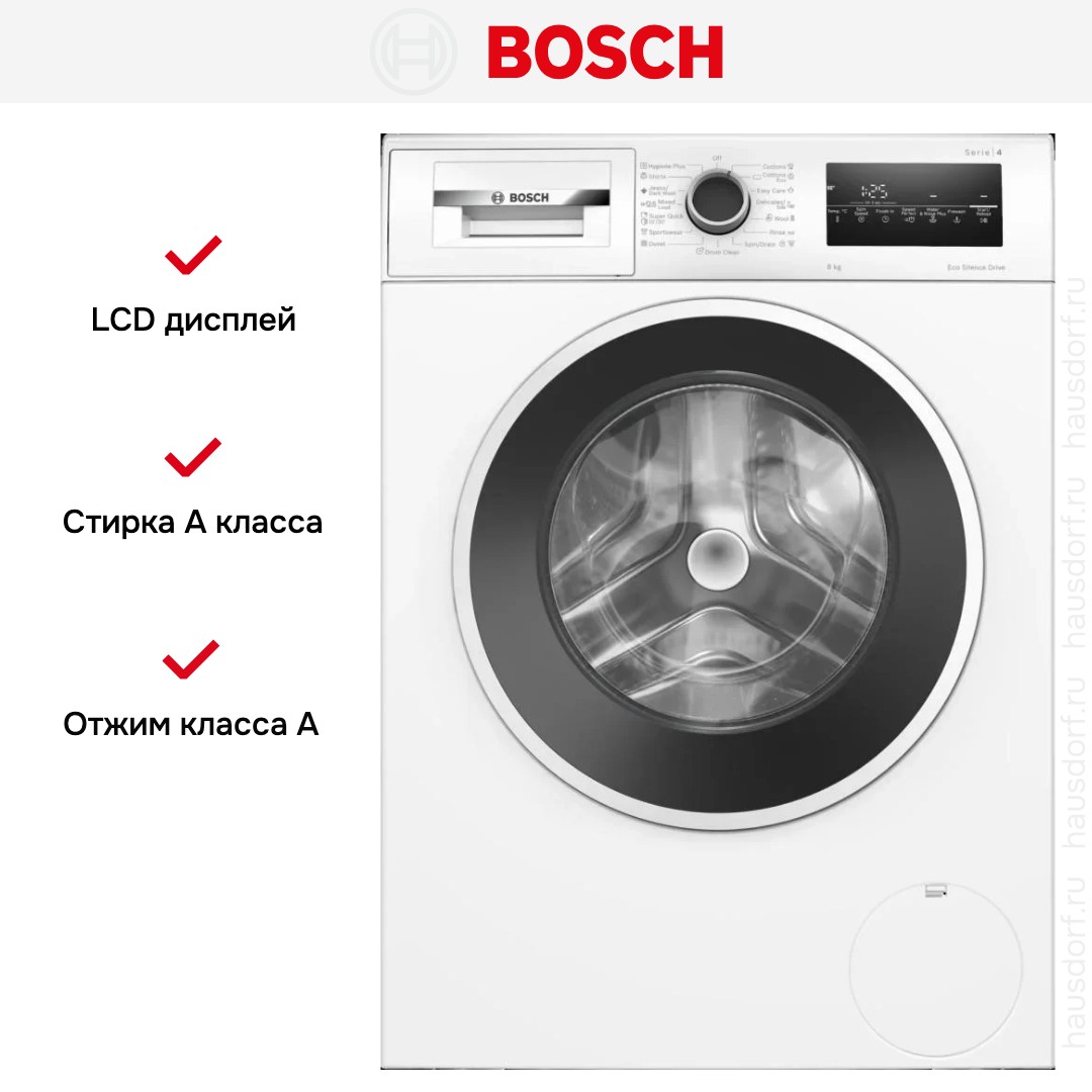Стиральная машина Бош WAN28201ME выпущена в стандартной конфигурации — устанавливается отдельно, поэтому рекомендуем заранее выделить для нее место в квартире. Благодаря классической фронтальной загрузке она привычна и удобна даже для тех, кто не очень разбирается в технике. Вместительность барабана средняя, поэтому ее хватит и для одиночек, и для семей с детьми. Максимальная загрузка: 8 кг.