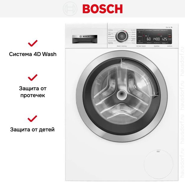 Система 4D Wash в стиральных машинах Bosch гарантирует лучший результат стирки благодаря оригинальной прямой подаче воды для оптимального смачивания белья и дополнительному отжиму Spin Wash для глубокого проникновения воды и моющего средства в волокна ткани даже при полной загрузке барабана.