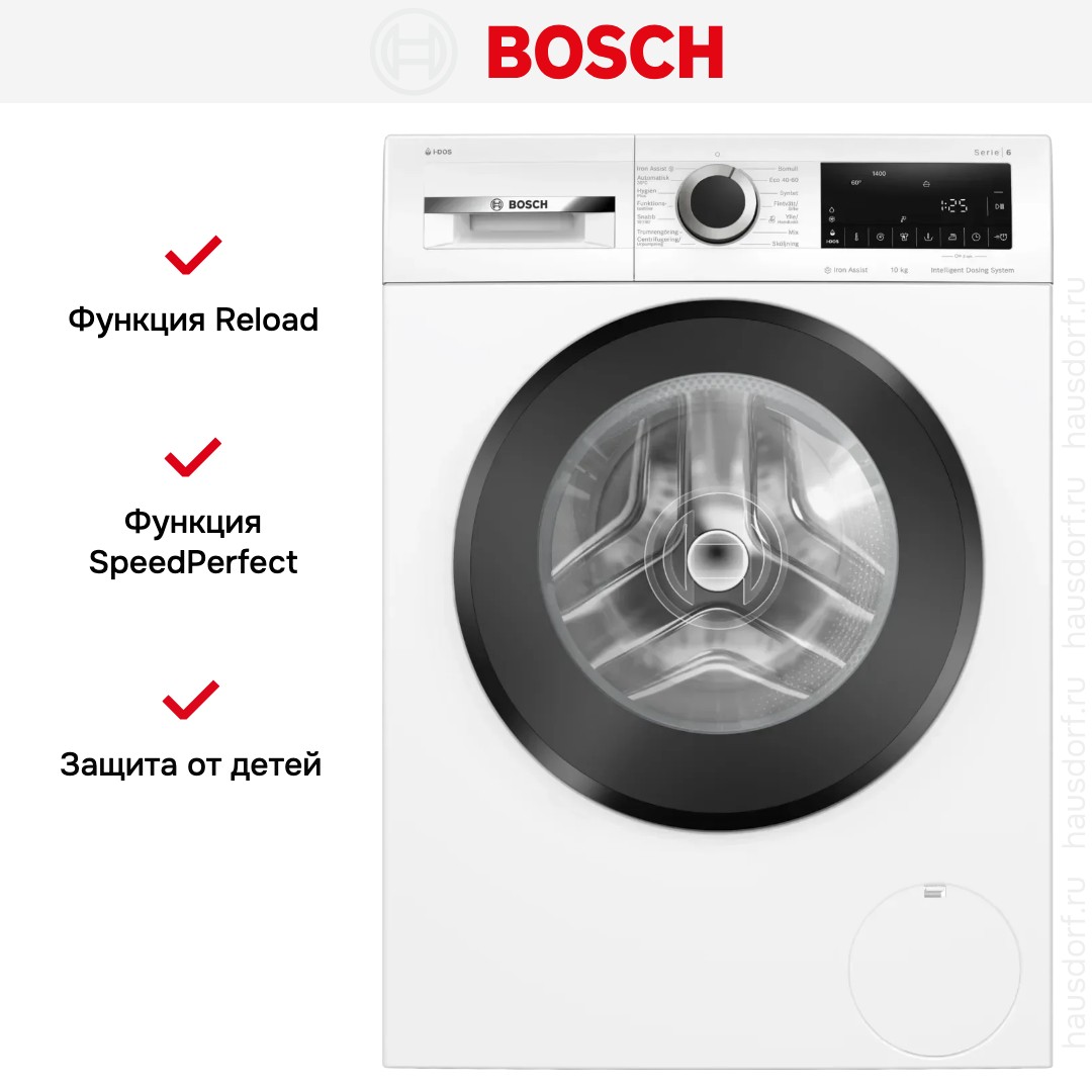 Функция Reload в стиральных машинах Bosch позволяет дозагрузить забытые вещи или извлечь предметы, оказавшиеся в барабане по ошибке, в любой момент после запуска программы. Система управления автоматически определяет объем воды в баке и быстро сливает ее для безопасного открытия дверцы люка.