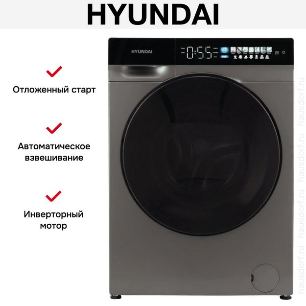 Стиральная машина Хендай WFE9230 темно-серый выпущена в стандартной конфигурации — устанавливается отдельно, поэтому рекомендуем заранее выделить для нее место в квартире. Благодаря классической фронтальной загрузке она привычна и удобна даже для тех, кто не очень разбирается в технике. В барабан помещается большое количество белья, что подойдет большим семьям или тем, кто часто стирает объемные вещи — постельное белье, верхнюю одежду. Максимальная загрузка: 10 кг.