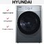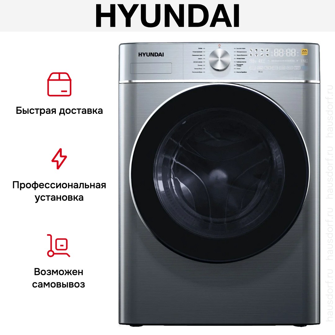 Стиральная машина Hyundai WME9413 представлена в современном темно-серебристом цвете с чёрным люком, что делает её элегантным дополнением интерьера. Корпус аккуратных габаритов 85×60×57 см рассчитан на стандартное размещение в кухонной нише или отдельном помещении. Угол открытия дверцы 135° и диаметр люка 33 см упрощают загрузку и выгрузку даже громоздких вещей.