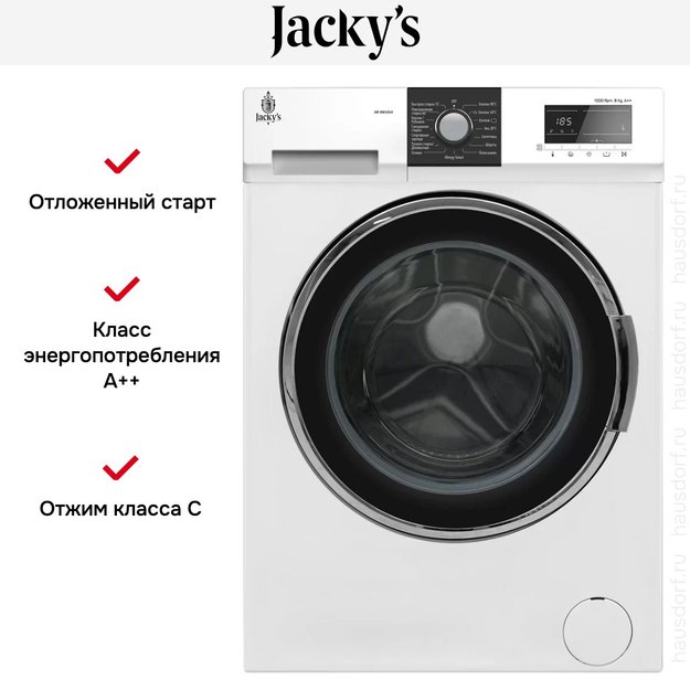 Jacky’s JW 8W10L0 — отдельностоящая стиральная машина с максимальной загрузкой 8 кг. Имеет стандартные габариты, поэтому подойдет владельцам средних или больших ванных комнат. Классический дизайн корпуса делает эту модель универсальной.