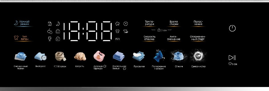Электронное управление удобно и понятно. Для выбора программ используются сенсорные кнопки. Количество режимов для стирки разных типов белья: 10.