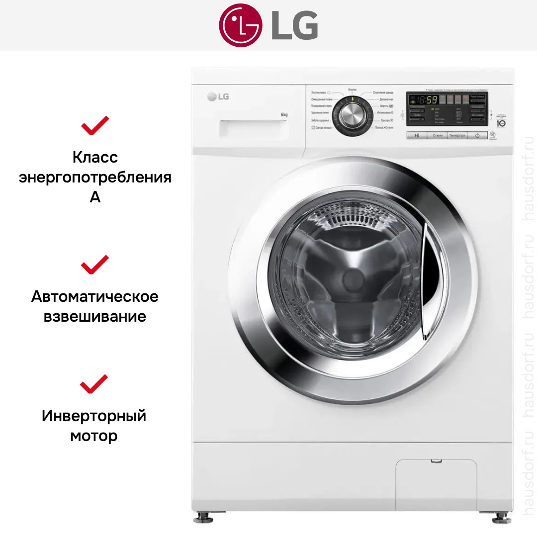 Стиральная машина LG F1096TD3 — белая отдельно стоящая модель с фронтальной загрузкой и эффектным люком из нержавеющей стали, который выглядит стильно в любом интерьере. Как покупатель бытовой техники, я ценю продуманную внешность: лаконичные линии, компактные габариты 85×60×55 см и нейтральный цвет позволяют легко вписать аппарат в нишу ванной или в кухонный гарнитур.