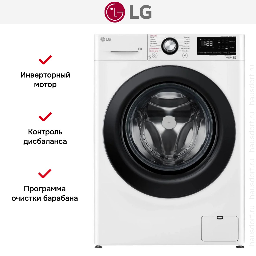 Стиральная машина LG F2V3PS6W представляет собой аккуратный фронтальный прибор в белом корпусе с контрастным черным люком, который смотрится современно и лаконично. Корпус имеет стандартные габариты 85×60×47.5 см, что упрощает размещение в нише или небольшой прачечной. Диаметр загрузочного люка 35 см и угол открытия 150° делают загрузку и выгрузку удобной даже при больших громоздких вещах. LED-дисплей, сенсорные кнопки и поворотный программатор сочетаются так, что панель интуитивно понятна и легко настраивается. Нержавеющий барабан гарантирует долговечность и бережную обработку тканей, а черный люк добавляет визуальной глубины дизайну.