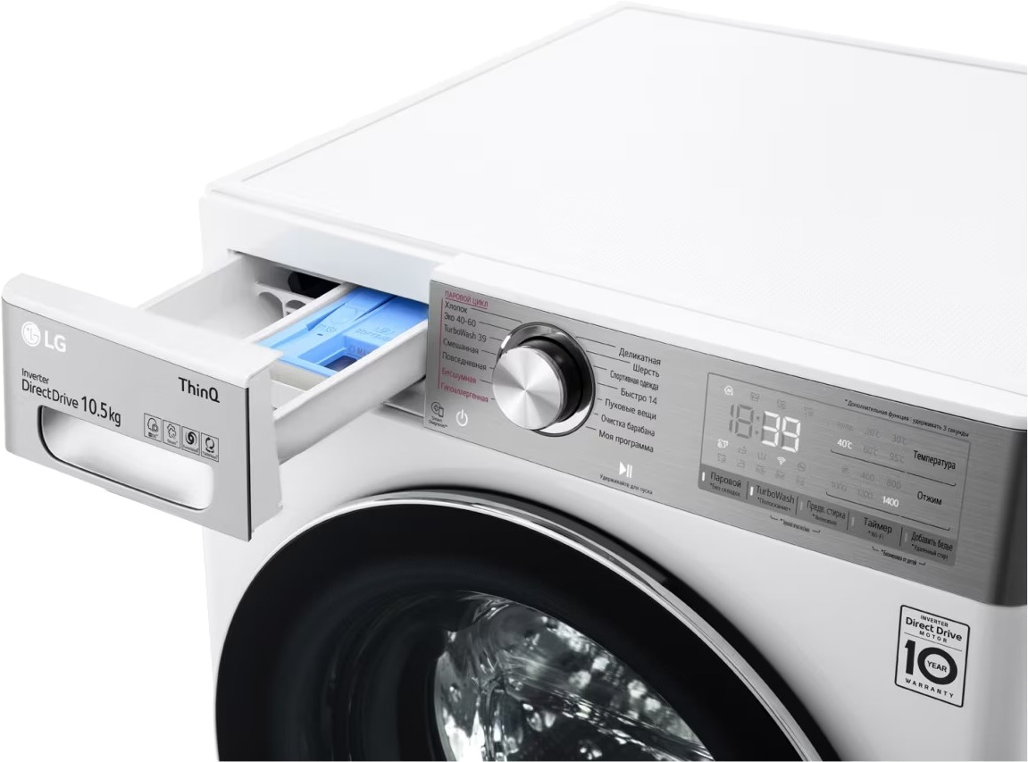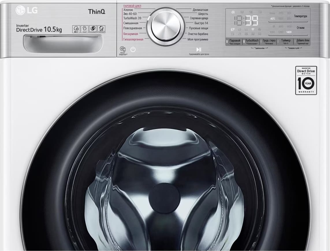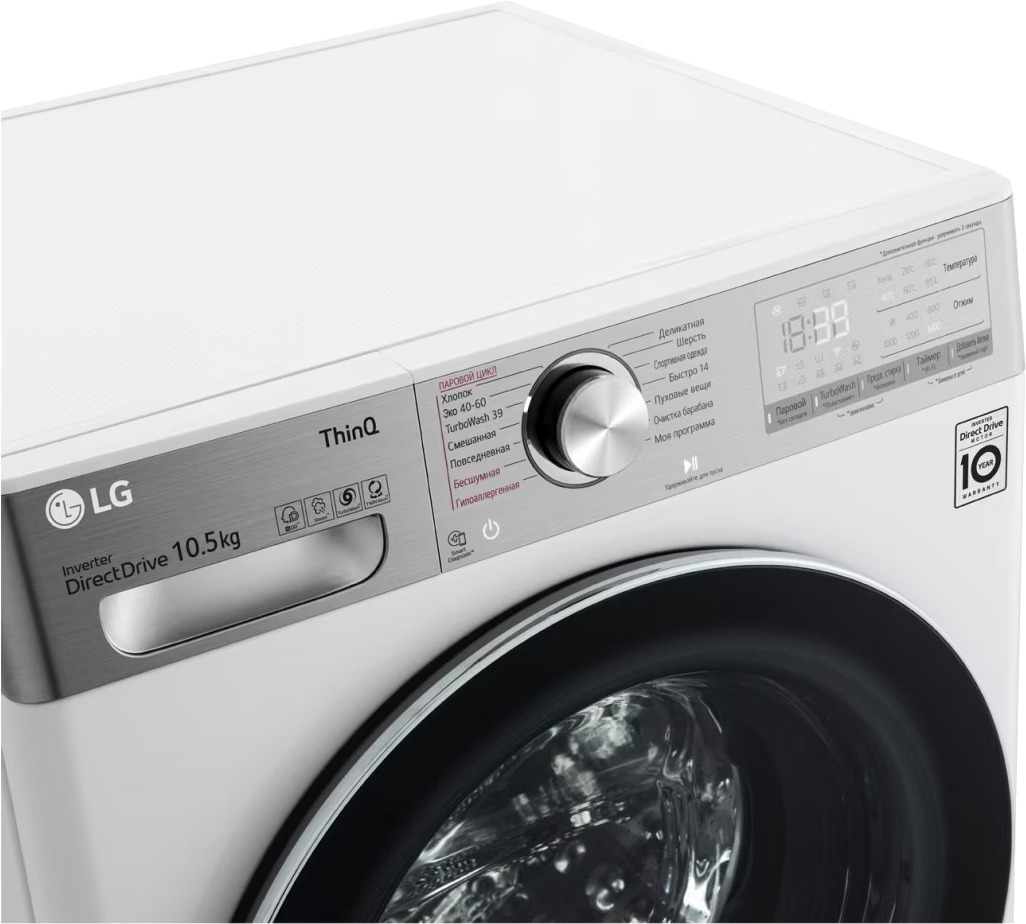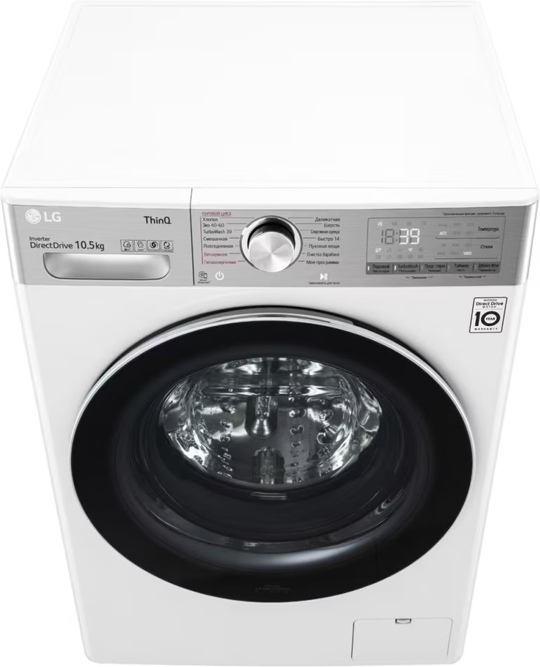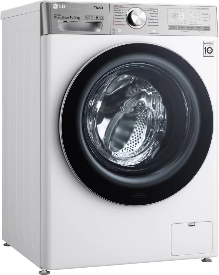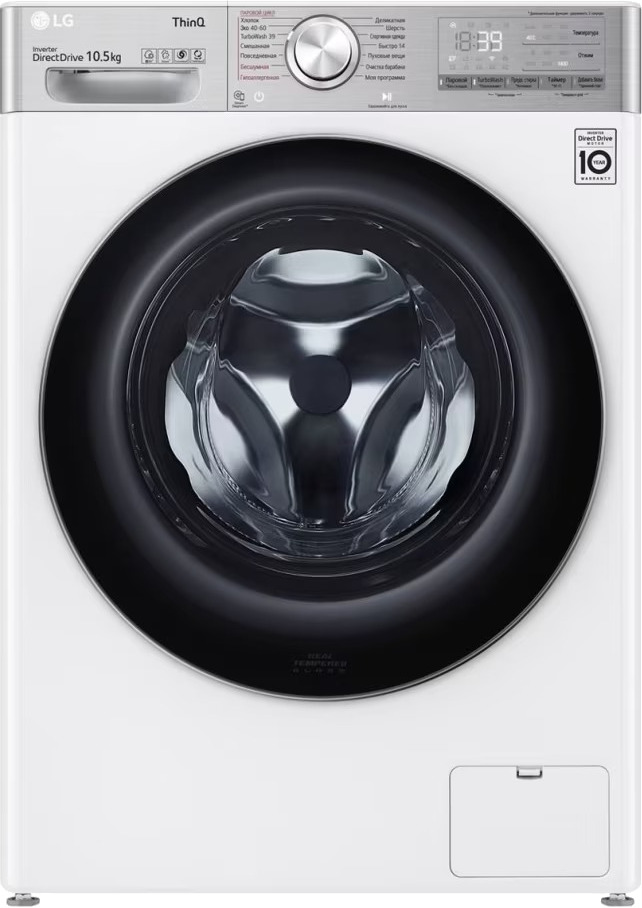 Стиральная машина Лджи TW4V9RW9E выпущена в стандартной конфигурации — устанавливается отдельно, поэтому рекомендуем заранее выделить для нее место в квартире. Благодаря классической фронтальной загрузке она привычна и удобна даже для тех, кто не очень разбирается в технике. В барабан помещается большое количество белья, что подойдет большим семьям или тем, кто часто стирает объемные вещи — постельное белье, верхнюю одежду. Максимальная загрузка: 10.5 кг.