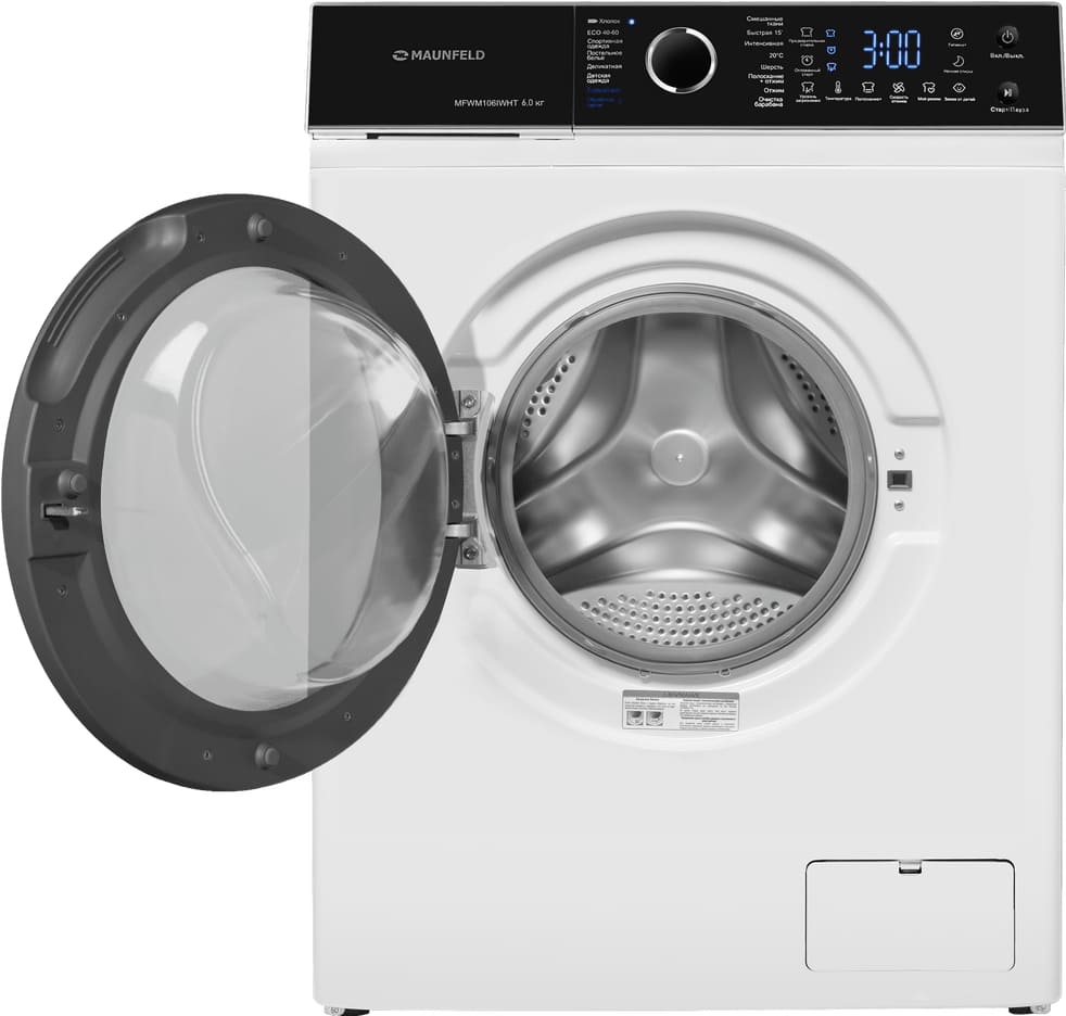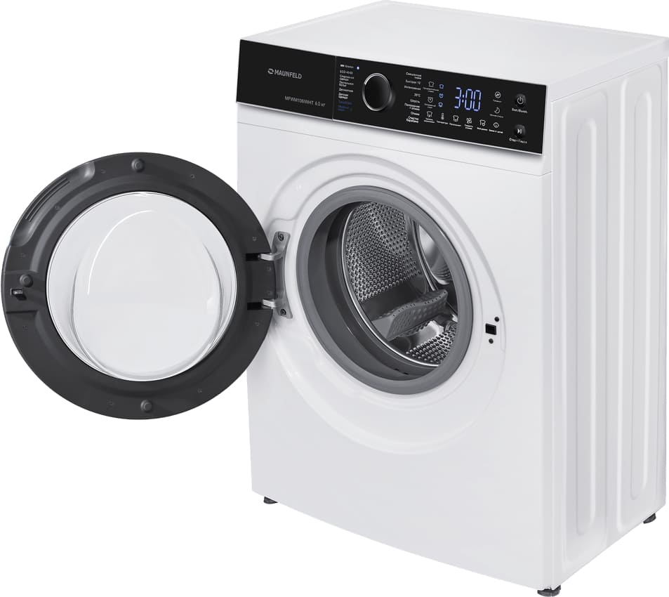 Стиральная машина Маунфилд MFWM106IWHT выпущена в стандартной конфигурации — устанавливается отдельно, поэтому рекомендуем заранее выделить для нее место в квартире. Благодаря классической фронтальной загрузке она привычна и удобна даже для тех, кто не очень разбирается в технике. За счет небольшой глубины данную модель предпочитают владельцы небольших квартир, студий. В барабан помещается не так много вещей за один раз, но тем, кто не любит копить вещи или просто мало стирает, будет достаточно. Максимальная загрузка: 6 кг.