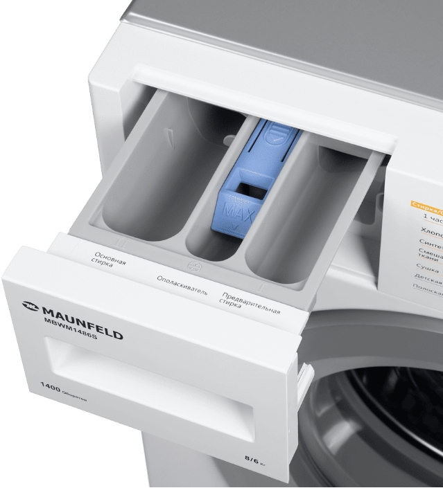 Стиральная машина Маунфилд MBWM1486STWH принадлежит к немногочисленному сегменту встраиваемой техники — для ее установки необходимо тщательно выбрать заранее нишу в мебельном гарнитуре. Благодаря классической фронтальной загрузке она привычна и удобна даже для тех, кто не очень разбирается в технике. За счет небольшой глубины данную модель предпочитают владельцы небольших квартир, студий. Вместительность барабана средняя, поэтому ее хватит и для одиночек, и для семей с детьми. Максимальная загрузка: 8 кг.