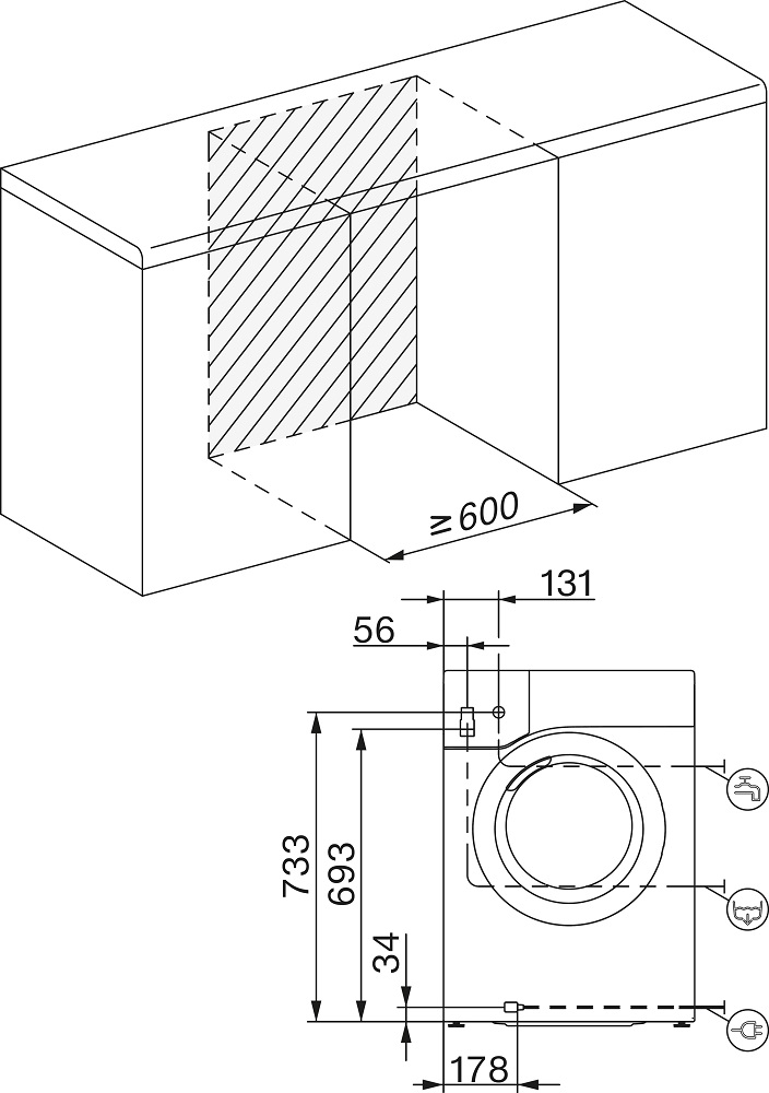 Машины с вертикальной загрузкой из-за своих конструктивных особенностей не могут встраиваться в мебель. Их высота составляет в среднем 89-90 см, и над ними необходимо оставить пространство для свободного открывания дверцы.