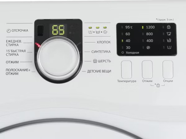 Достаточно простыми, но гораздо более информативными являются цифровые дисплеи, которые могут отображать числовую информацию и ограниченное количество символов. На таком дисплее, например, может отобразиться номер программы, скорость отжима, блокировка люка, отсрочка старта, температура воды, время, оставшееся до конца работы, символические обозначения действующих функций и прочая достаточно простая информация. Изображение может быть разного цвета — белого, зеленого или голубого, в любом оно будет хорошо заметно даже при отключенном освещении.