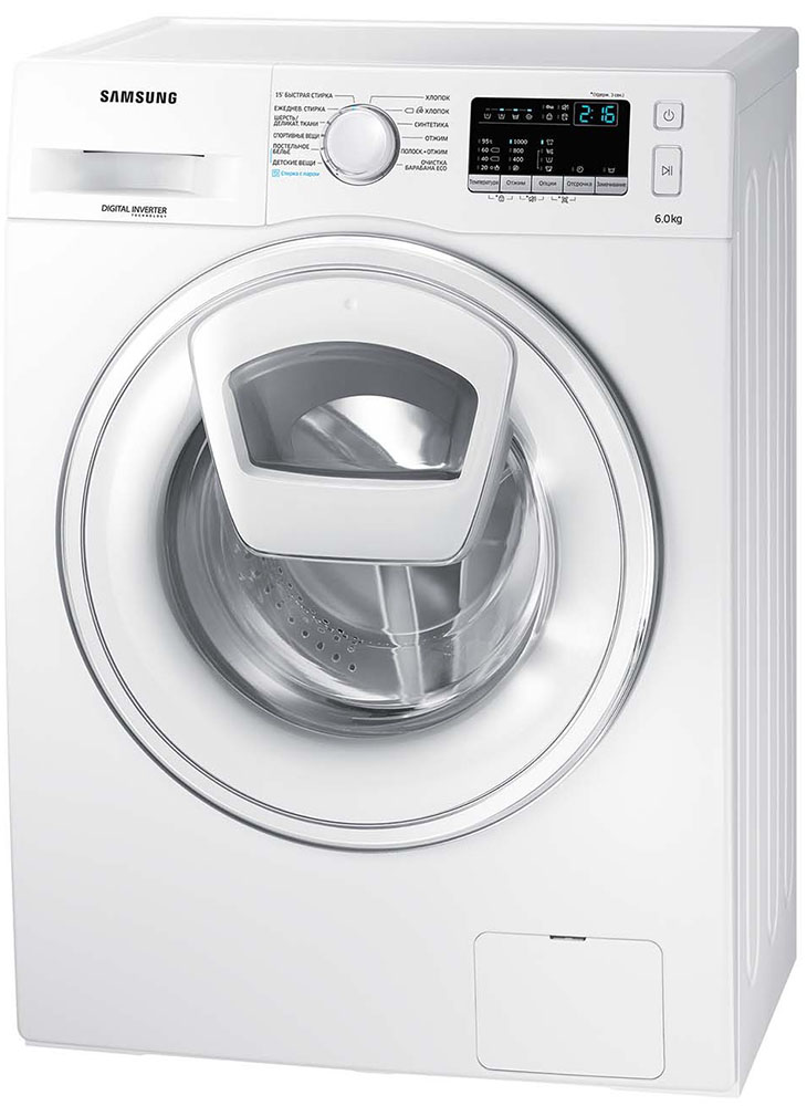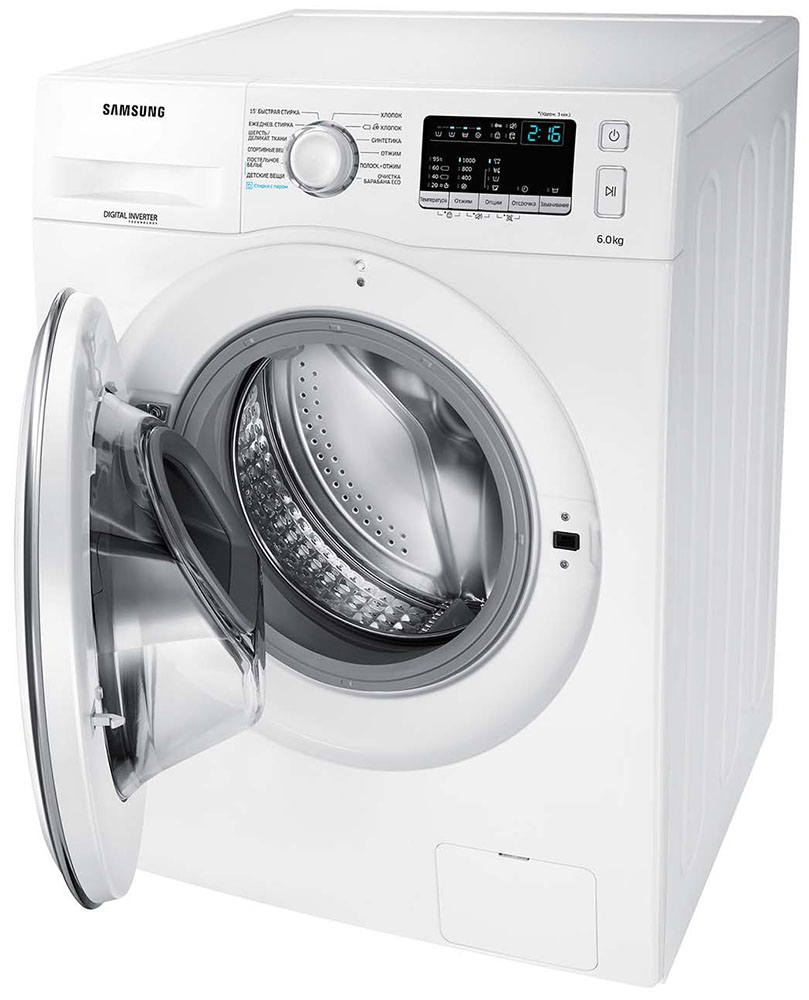 Стиральная машина Самсунг WW60K40G08W выпущена в стандартной конфигурации — устанавливается отдельно, поэтому рекомендуем заранее выделить для нее место в квартире. Благодаря классической фронтальной загрузке она привычна и удобна даже для тех, кто не очень разбирается в технике. За счет небольшой глубины данную модель предпочитают владельцы небольших квартир, студий. В барабан помещается не так много вещей за один раз, но тем, кто не любит копить вещи или просто мало стирает, будет достаточно. Максимальная загрузка: 6 кг.