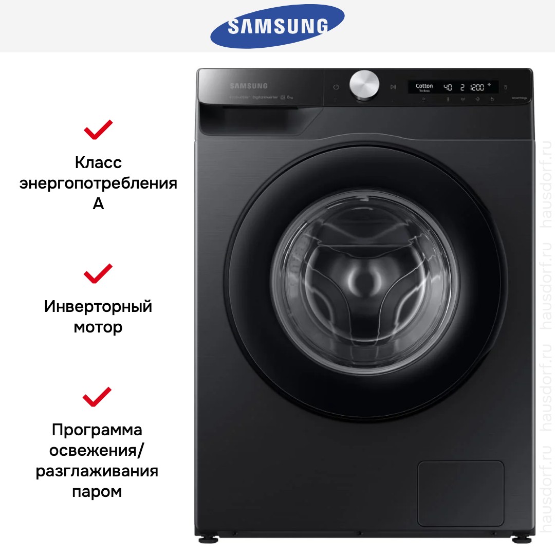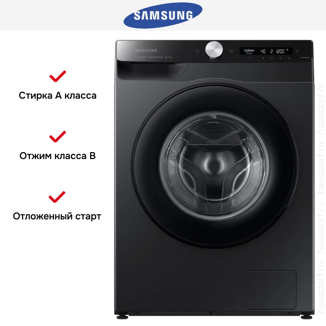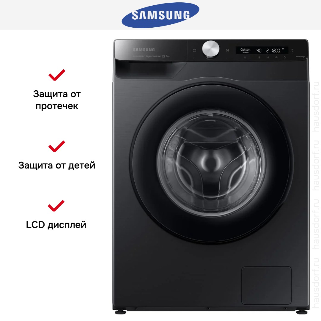 Стиральная машина Samsung WW80AG6S28ABLP — современное решение для дома, объединяющее лаконичный внешний вид и продуманный функционал. Черный корпус и затемненный люк придают технике эстетику премиум-класса и легко вписываются в интерьер. Глубина всего 45 см делает прибор удачным выбором для ограниченных по пространству помещений, а высота 85 см и ширина 60 см соответствуют стандартам встраивания и размещения в ниши. Наклонная панель управления улучшает обзор и упрощает работу с программами, а сочетание сенсорных кнопок и поворотного регулятора делает выбор режима быстрым и интуитивным.