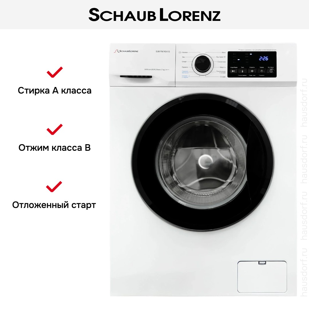 Стиральная машина Schaub Lorenz SLW-FW7414-IS имеет белый корпус, снабженный контрастным черным люком и фурнитурой. Ее габариты 83.5×59.5×48 см делают прибор удобным для не очень больших кухонь и ванных комнат. Ножки с регулировкой высоты позволяют быстро выставить агрегат по уровню на неровном полу, что снижает вибрации при работе и продлевает срок службы техники.