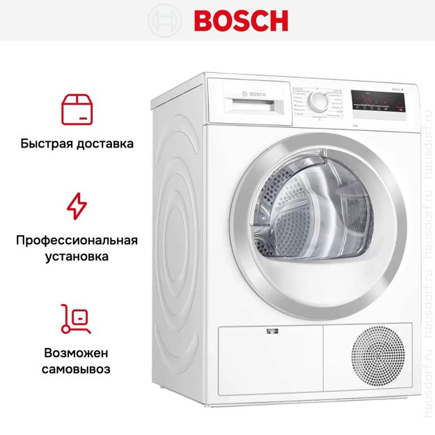 Сушильная машина Bosch предназначена для домашнего использования, поэтому имеет стандартные габариты и большое разнообразие программ. Так как она устанавливается отдельно, нужно заранее найти достаточно места в помещении.