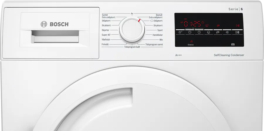 Дисплей на сенсорной или кнопочной панели управления сушильной машины позволяет оперативно отслеживать ход работы, а также регулировать параметры сушки. Самые простые отдельно стоящие модели с электронной системой управления оснащаются цифровым дисплеем, на котором отображается выбранная программа сушки, время, оставшееся до окончания цикла и дополнительные опции — например, отсрочка старта. Устройства более высокого уровня могут оснащаться текстовыми FSTN-дисплеями большого размера или полноцветными графическими дисплеями, позволяющими выбирать программы и опции при помощи меню.