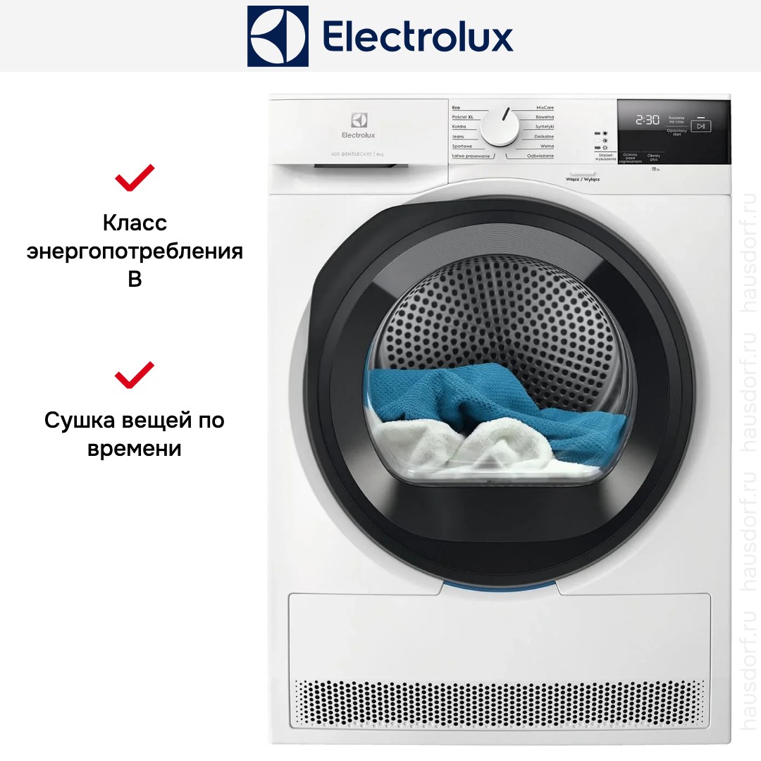Сушильная машина Electrolux EW6D295GE — современное устройство для дома, объединяющее экономичность, аккуратность внешнего вида и продуманный набор функций. Корпус белого цвета гармонично сочетается с чёрной панелью управления и круглой дверцей со стеклом, создавая сдержанный, стильный образ для любой техники‑зоны. Отдельностоящая установка с регулировкой ножек и правым навесом облегчает монтаж, а компактные габариты 85×59.6×63.6 см позволяют вписать прибор в стандартную нишу. Тепловой насос в основе режима сушки даёт эффективность при классе энергоупотребления B и среднем годовом расходе около 103 кВт·ч, при мощности подключения 550 Вт. Вместительность барабана до 9 кг и двенадцать программ покрывают хлопок, лён, синтетику, деликатные ткани, шерстяные изделия и тонкое бельё; предусмотрены режимы для джинсов, спортивной одежды, смешанных загрузок, объёмных вещей с пуховым наполнителем и быстрая экспресс‑сушка. Интеллектуальная система GentleCare автоматически адаптирует температуру и длительность, гарантируя аккуратный уход и возможность сушки «в шкаф» по остаточной влажности. Пользователь взаимодействует через горизонтальную панель с поворотным программатором и сенсорными клавишами, цифровой дисплей информирует о ходе цикла, оставшемся времени, необходимости опустошить контейнер для конденсата и проблемах с фильтром или сливом; есть отсрочка старта, сигнал по окончании и функция разглаживания/антисминания для облегчения глажки.
