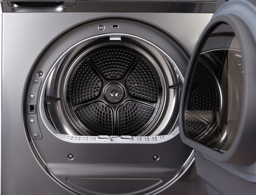 Тип сушки белья в данной модели — конденсационная с тепловым насосом. Это самый распространенный вариант, так как его просто реализовать и в работе он надежен, безопасен и удобен.