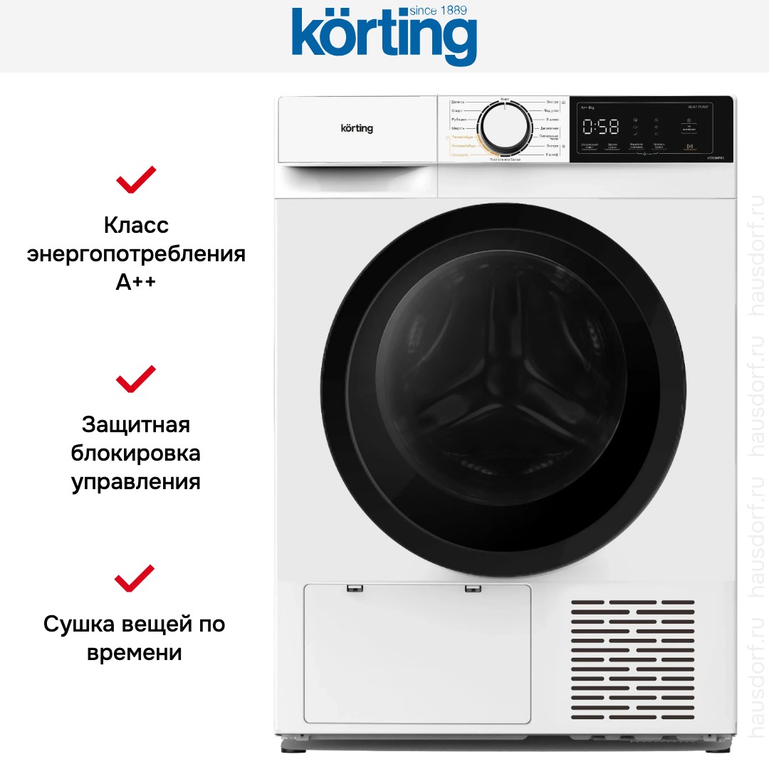 Сушильная машина Korting KD 60HP83 представлена как аккуратный, продуманный по форме и функциям бытовой прибор, сочетающий компактные габариты 84.5×59.5×60 см с возможностью установки отдельно или в колонну, благодаря чему устройство легко впишется в интерьер и организованное пространство утилитной зоны. Белый корпус с панелью управления в бело-черной гамме и крупной круглой дверью с черным стеклом создает стильный контраст и ощущение премиальности, а диаметр загрузочного люка 375 мм и угол открытия 165° обеспечивают удобство при загрузке и выгрузке белья; правая навеска дверцы и регулируемые ножки добавляют гибкости при монтаже. Внутренний мир аппарата также продуман: объем барабана 116 л и номинальная загрузка 8 кг позволяют обрабатывать как семейные наборы постельного белья, так и отдельные объемные вещи, при этом барабан выполнен из нержавеющей стали, что гарантирует долговечность и бережный уход за тканями. Технологическая основа — тепловой насос с компрессором Heat Pump и хладагентом R290 — обеспечивает эффективное энергосбережение, подтвержденное классом A++ и среднегодовым потреблением 216 кВт·ч, при этом номинальная потребляемая мощность составляет 0.8 кВт; такой подход снижает затраты электроэнергии и делает эксплуатацию более экономичной. Управление полностью электронное с горизонтальной панелью, комбинированным органом управления: поворотным программатором и сенсорными клавишами, цифровым дисплеем и информативной индикацией оставшегося времени, задержки старта, заполнения ворсового фильтра, активных функций и возможных неисправностей; специальный набор клавиш позволяет выбирать степень и время сушки, устанавливать отсрочку запуска от 1 до 24 часов, активировать защиту от сминания на 120 минут, осуществлять старт/пауза и блокировать панель для защиты от детей. Функциональный блок программ насчитывает 15 вариантов, включая стандартные режимы для хлопка/льна и синтетики, деликатные режимы для шерсти и мужских сорочек, а также обычную деликатную программу; предусмотрены режимы для спортивного белья, смешанных загрузок, джинсов и постельного белья, режимы сушки по остатку влаги: под утюг, в шкаф и экстрасушка, а также опция освежения. Для специальных задач аппарат предлагает теплый и холодный обдув, антисминание, возможность сушки по времени и функцию дезинфекции ультрафиолетом; в конструкции имеется емкость для сбора конденсата, автоматическое отключение по завершении цикла и встроенная сервисная диагностика, а также опция отключения звуковых сигналов. Уровень шума при работе достигает 65 дБ, что делает работу достаточно комфортной; масса нетто 41 кг, брутто 45 кг, длина сетевого кабеля 150 см, глубина с открытой дверцей 105.3 см, а упаковочные габариты — 90×64×69 см — упрощают транспортировку и размещение. Данный аппарат сочетает эргономику, энергоэффективность и разнообразие программ, что делает его удобным решением для дома, где важны качество обработки тканей, экономия ресурсов и простота эксплуатации; упомянутая сушильная машина Korting KD 60HP83 гармонично впишется в современные бытовые интерьеры, предлагая надежность и многофункциональность в компактном исполнении.