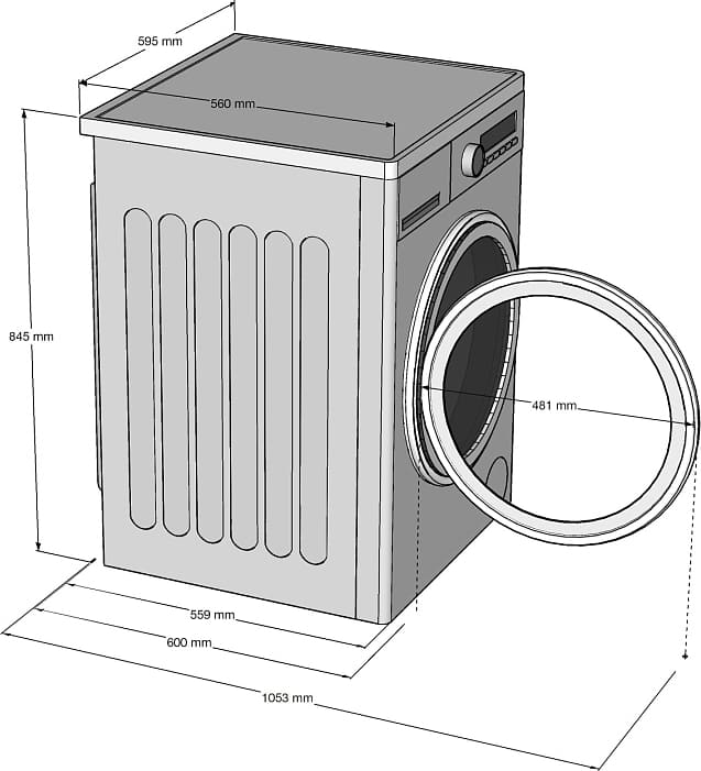 Ширину сушильной машины следует учитывать при любом варианте установки. Стандартное значение этого показателя составляет 59-60 см: такие устройства подходят для установки в колонну со стиральными или бок-о-бок с ними, а также для встраивания под столешницу или в кухонную тумбу. Они являются наиболее востребованными благодаря достаточно большому весу загрузки. Наименьшая ширина сушилок составляет 55-56 см, а максимальное значение этого параметра достигает 70 см. Самой большой шириной отличаются модели для профессионального использования, рассчитанные на увеличенный вес загрузки.