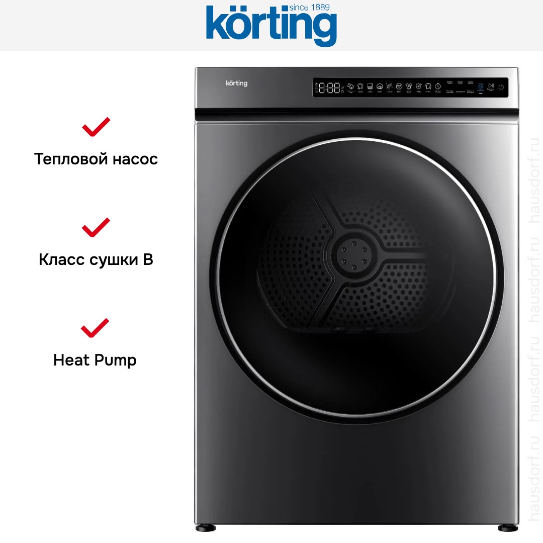 Тепловой насос в сочетании с инверторным мотором обеспечивает экономичную эксплуатацию с энергетическим классом A+++. Такая схема требует меньше электроэнергии по сравнению с традиционными вариантами и мягче воздействует на волокна. Набор из десяти программ охватывает хлопок и лен, шерстяные вещи, смешанные загрузки, экспресс-сушку и деликатные режимы для пуховых изделий. Дополнительные режимы включают обработку паром, гигиеническую обработку и функцию дезинфекцию ультрафиолетом для одежды детей или аллергиков.