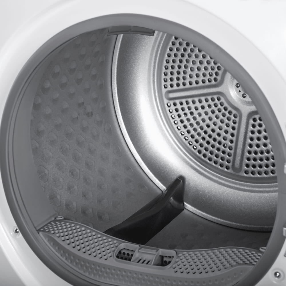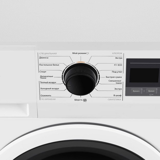 Тип сушки белья в данной модели — тепловой насос. Благодаря этому воздух поступает в барабан уже теплым, что ускоряет работу.