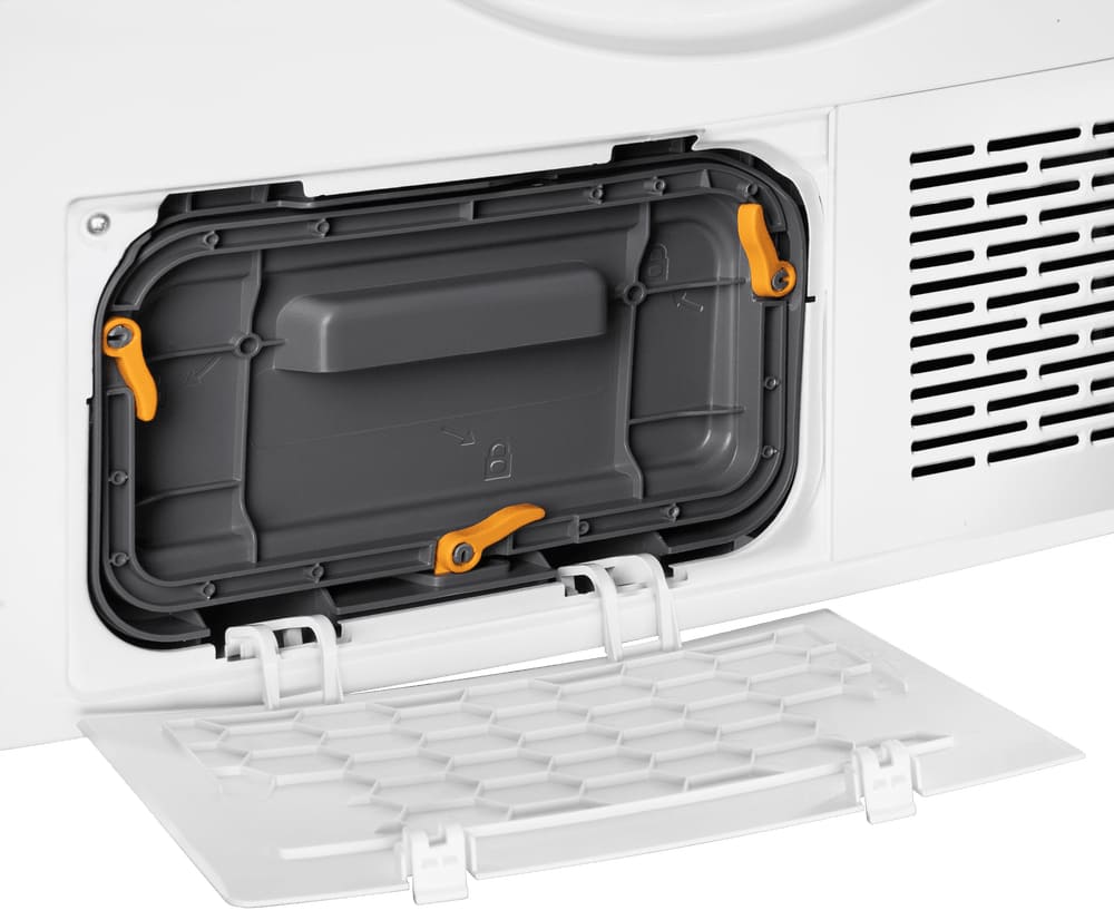 Сушильные машины конденсационного типа, как и устройства с тепловым насосом, не требуют присоединения к системе вентиляции и подключаются только к электросети. Конденсат, который удаляется из загруженного белья, стекает в специальный контейнер. Он расположен так, чтобы его извлечение было максимально удобным — например, в верхней части корпуса, там, где у стиральных машин находится лоток для порошка. Опустошать этот контейнер необходимо вручную — как правило, после завершения каждого цикла работы. О необходимости слива конденсата предупреждает специальный индикатор на панели управления.