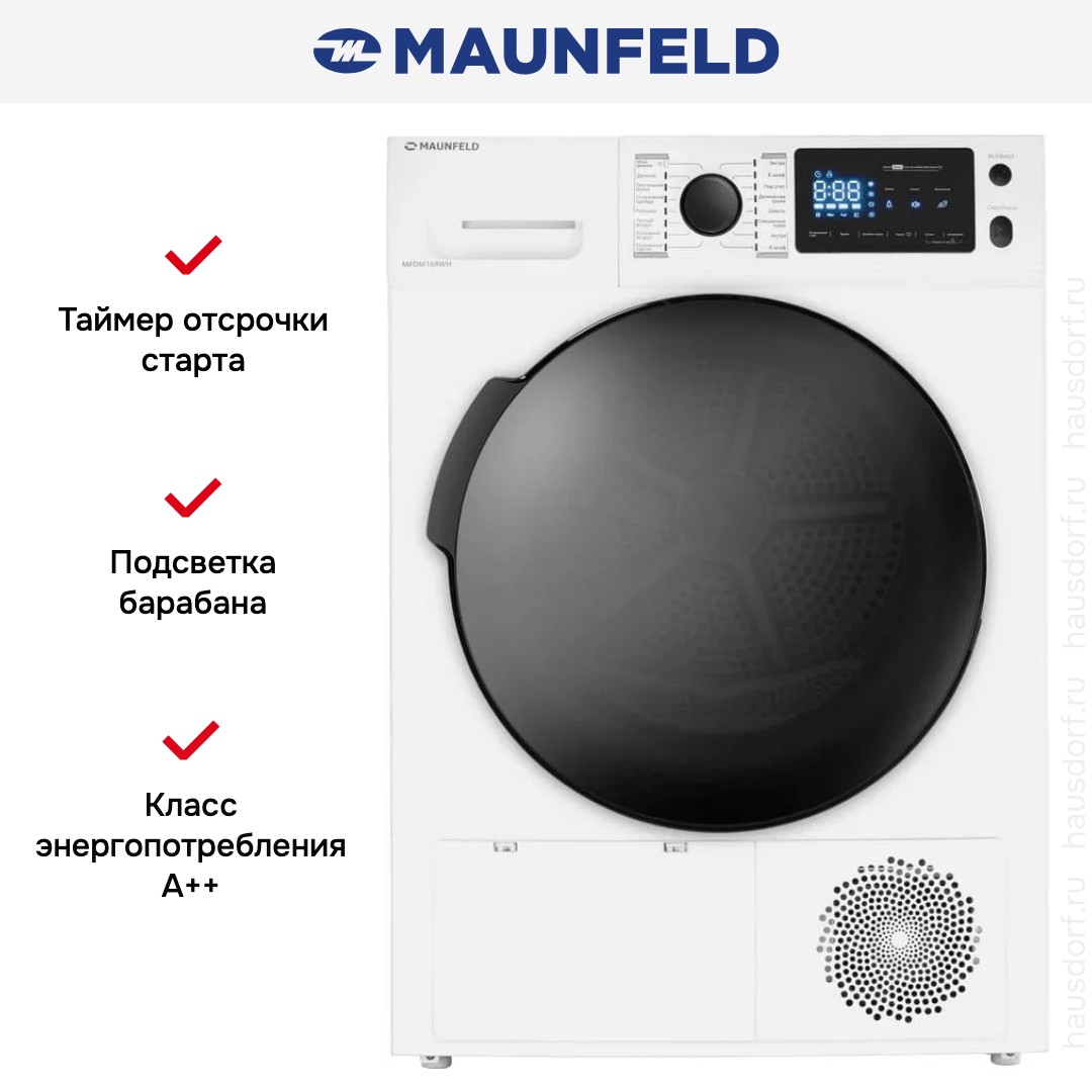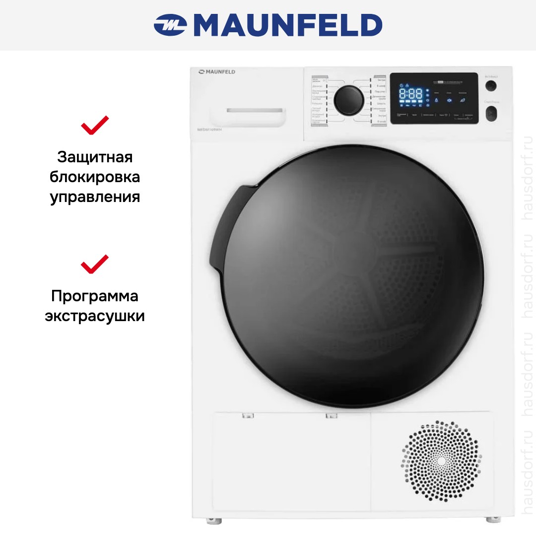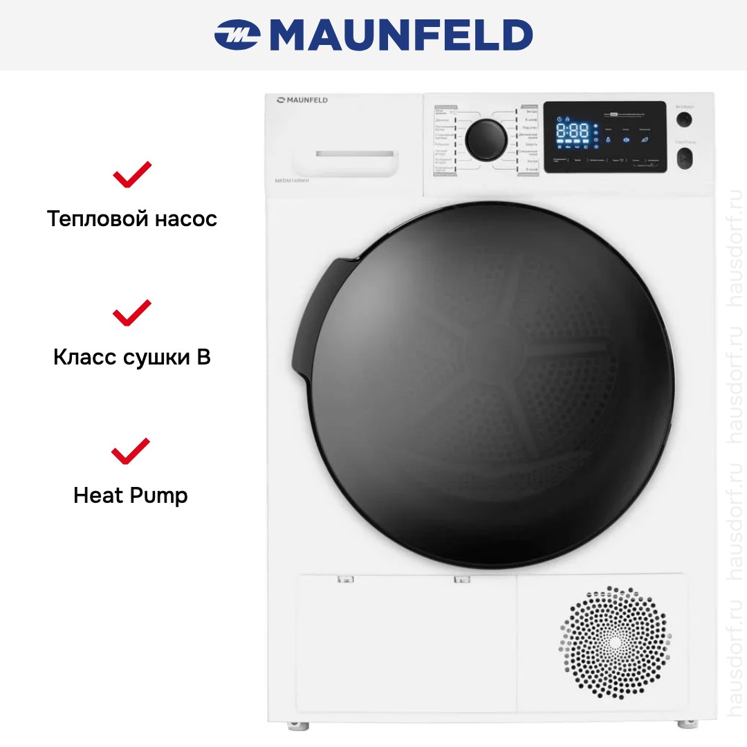 Сушильная машина Maunfeld MFDM169WH — современное напольное решение для дома, объединяющее бережную тепловую технологию и удобный набор функций для аккуратного ухода за одеждой. Корпус отдельно стоящего прибора выполнен в белом цвете с контрастной чёрной дверцей и панелью управления в бело‑чёрной гамме; компактные габариты 85×59,5×65,5 см позволяют разместить агрегат в стандартной нише, а регулировка ножек обеспечит точную нивелировку. Эффективность работы обеспечивается инверторным двигателем и компрессорным тепловым насосом (Heat Pump), что даёт класс энергопотребления A++ при среднегодовом расходе 259 кВт·ч и класс сушки B. Вместимость барабана из нержавеющей стали — 9 кг, внутренняя подсветка и сотовая структура поверхности барабана бережно обращаются с тканями, снижая износ. Внутренний объём загружаемого люка диаметром 375 мм удобен для больших вещей, а угол открытия дверцы в 160° облегчает загрузку постельного белья и объёмных вещей; глубина при открытой дверке достигает 111 см. Панель управления расположена горизонтально, сочетает поворотный программатор, сенсорные кнопки и механические клавиши, а информативный LED‑дисплей показывает этапы цикла, оставшееся время, отсрочку старта и состояние ёмкости для конденсата и фильтра от ворса. В ассортименте предусмотрено 16 программ, включая стандартные режимы хлопок/лён и синтетику, деликатные опции для шерсти, мужских сорочек и простой деликатной одежды, специальные режимы для спортивного и смешанного белья, джинсов, а также отдельная программа для постельного белья; набор функций ухода предполагает тёплый и холодный обдув, антисмятие и обработку паром для освежения вещей. Контроль конечной влажности позволяет гибко выбрать состояние после цикла — под утюг, экстрасушка или готово в шкаф — а таймер с отсрочкой старта от 1 до 24 часов добавляет гибкости в планировании стирки и сушки. Практичные детали включают съёмную ёмкость для конденсата с возможностью подключения дренажного шланга в комплекте, ворсовый фильтр и держатель для шланга; шум работающего аппарата составляет 66 дБ, что делает его приемлемым для бытового использования. Электропитание рассчитано на 220-240 В, 50 Гц; предохранитель 3,9 A, пиковая потребляемая мощность 0,85 кВт; в системе используется хладагент R134a. Безопасность и удобство повышения уровня обслуживания реализованы через блокировку от детей, сохранение пользовательских настроек (MyFavourite) и встроенную сервисную диагностику. В комплект поставки входят основные аксессуары: ворсовый фильтр, дренажный шланг, соединитель и держатель шланга; упаковочные габариты составляют 88×67×68 см, вес нетто 48 кг (брутто 52 кг). Этот аппарат станет надёжным помощником для тех, кто ценит экономию ресурсов, широкий выбор режимов и аккуратное отношение к вещам в рамках современных сушильных машин.