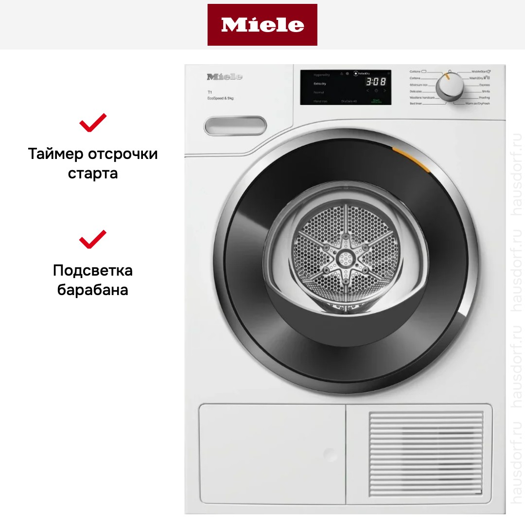 Запатентованная гарантирует согласованную работу и автоматическую очистку теплообменника и фильтра, так что пользователю не нужно беспокоиться и следить за степенью засорения теплообменника ворсом, а затем извлекать и прочищать его вручную, что также занимает значительное время. Таким образом удается поддерживать короткие рабочие циклы для сушки белья из ткани любого вида, а значит, и экономить электроэнергию: срок службы машины при этом не имеет значения. Все сушильные машины Miele, оснащенные технологией EcoDry, относятся к наивысшему классу энергоэффективности А+++.