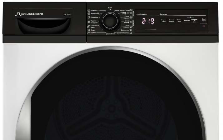 Панель управления в современных сушильных машинах находится в верхней части корпуса. Элементы управления — дисплей, поворотный переключатель, кнопки, индикаторы, — располагаются таким образом, чтобы пользователь мог легко ориентироваться в выборе параметров работы. В большинстве моделей панель управления располагается строго вертикально. Это не слишком удобно для пользователей высокого роста или для тех, кто имеет проблемы со зрением: им приходится наклоняться, например, чтобы выбрать ту или иную программу. В связи с этим некоторые производители начали переносить панель управления на крышку машины: так, фирма Schulthess предлагает две модификации одной и той же модели — с вертикальной и горизонтальной панелью управления.
