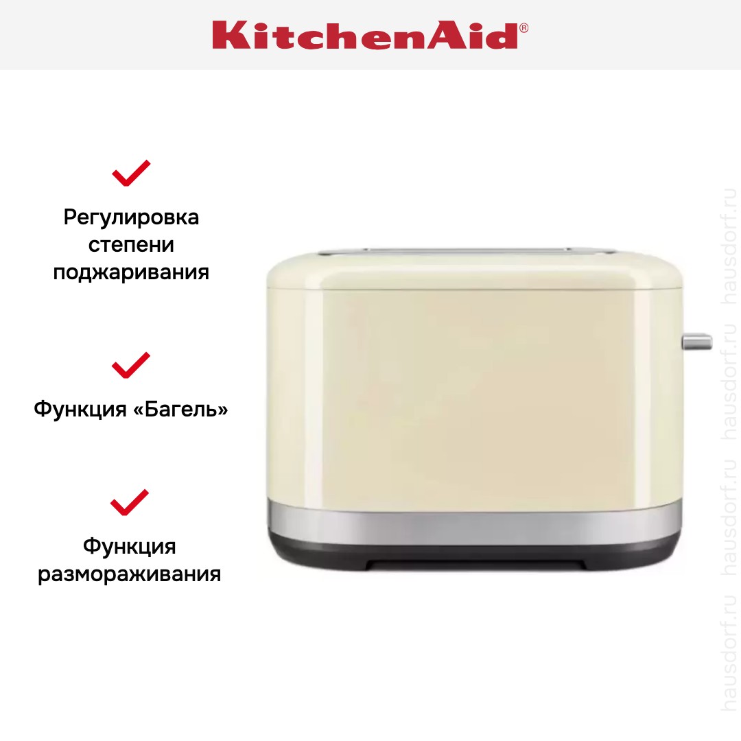Тостер KitchenAid Artisan 5KMT2109EAC — компактный стационарный прибор в кремовом цвете, который аккуратно вписывается в современный интерьер кухни. Его габариты 20×40×14 см и вес 1,85 кг делают его заметно компактным и удобным для размещения на столешнице без утяжеления пространства. Комбинация пластика и стали в корпусе обеспечивает приятную на ощупь поверхность и повышенную прочность в местах, подверженных механическим нагрузкам.