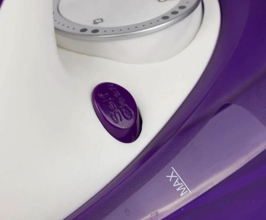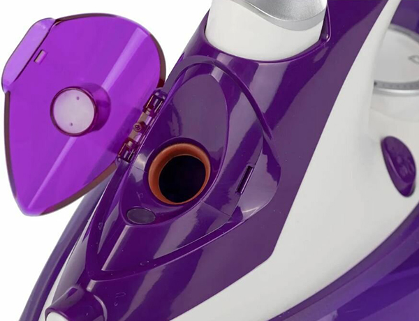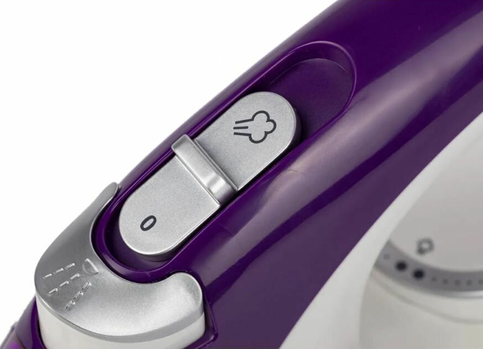 Выглядит компактно и выразительно: корпус фиолетового цвета собран из пластика, а профиль — лаконичный и продуманный. Габариты 14.5×13.3×32 см и вес 1.3 кг делают прибор легко управляемым и незаметным на гладильной доске. Ручка и контрольные элементы расположены так, чтобы не мешать при манипуляциях, а общий силуэт помогает направлять прибор точно вдоль швов.