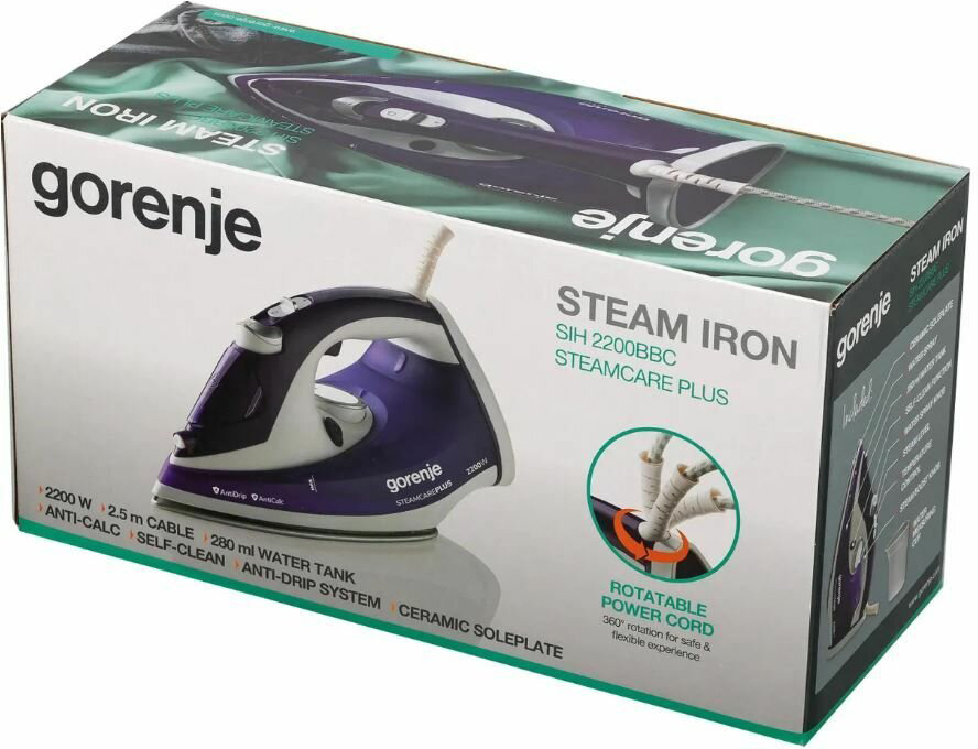 - Высокая мощность 2200 Вт обеспечивает быстрый разогрев и стабильное выделение пара для эффективной глажки.