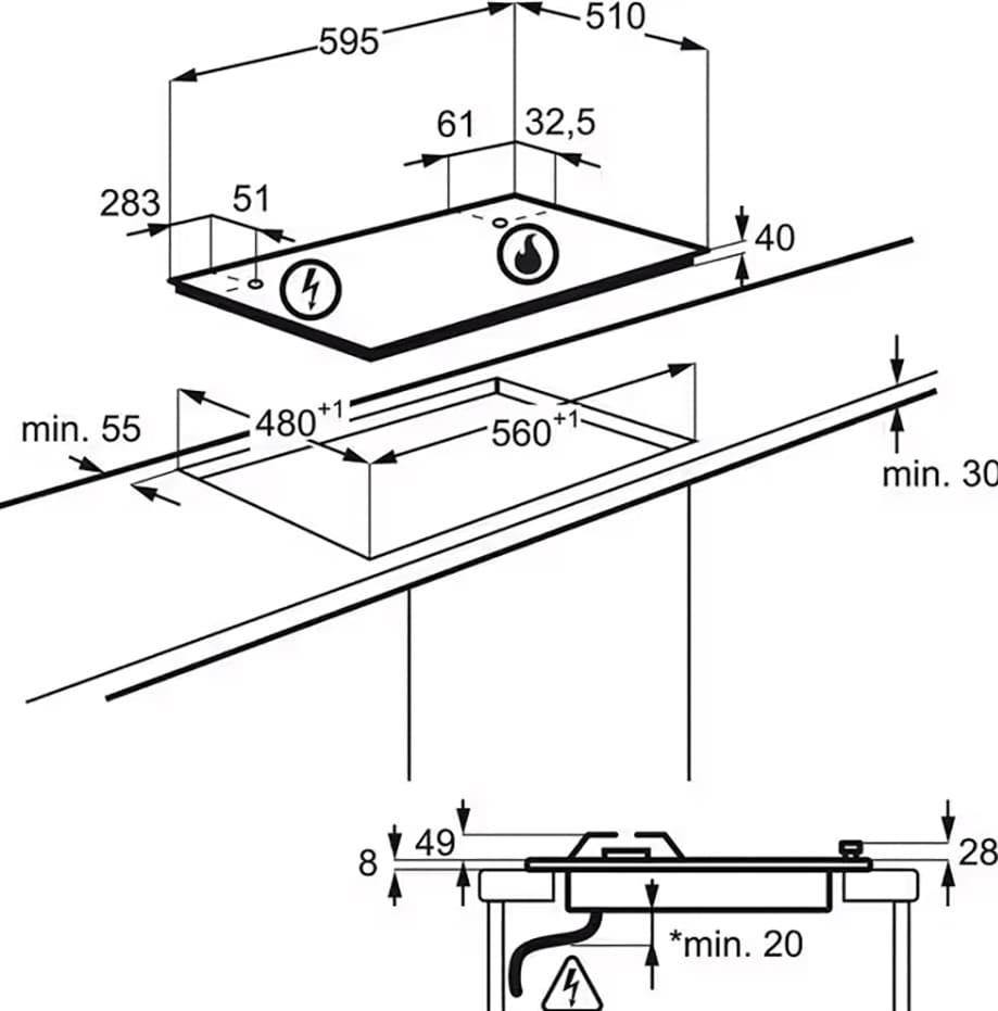 Отверстие в нише выполняют, исходя из размеров самой варочной панели — они должны соответствовать друг другу либо немного превышать размеры выреза. При выборе наиболее распространенной варочной панели с 4 конфорками в столешнице вырезается отверстие шириной 59 см и глубиной около 49-50 см. Толщина столешницы должна быть немного меньше, чем высота варочной панели, в противном случае панель придется заглубить, чтобы она не слишком выступала.