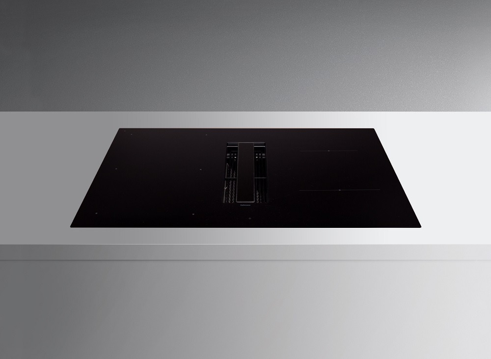 Вытяжка, встроенная в варочную панель — достаточно удобный вариант, позволяющий сэкономить место в кухне. Такая конструкция позволяет лучше улавливать испарения, не давая им распространяться по всему помещению, и способствует более качественной очистке воздуха. Большинство подобных моделей может работать только в режиме рециркуляции воздуха, с удалением капель жира, сажи, неприятных запахов при помощи системы фильтров. Работу в режиме отвода загрязненного воздуха через систему вентиляции организовать довольно сложно, поскольку вытяжка располагается низко над полом. Часто варочная панель находится на кухонном острове, что также мешает присоединению к вентиляции. Еще одна особенность подобных моделей состоит в том, что под варочной панелью нельзя разместить духовку или другую технику, так как место будет занято.