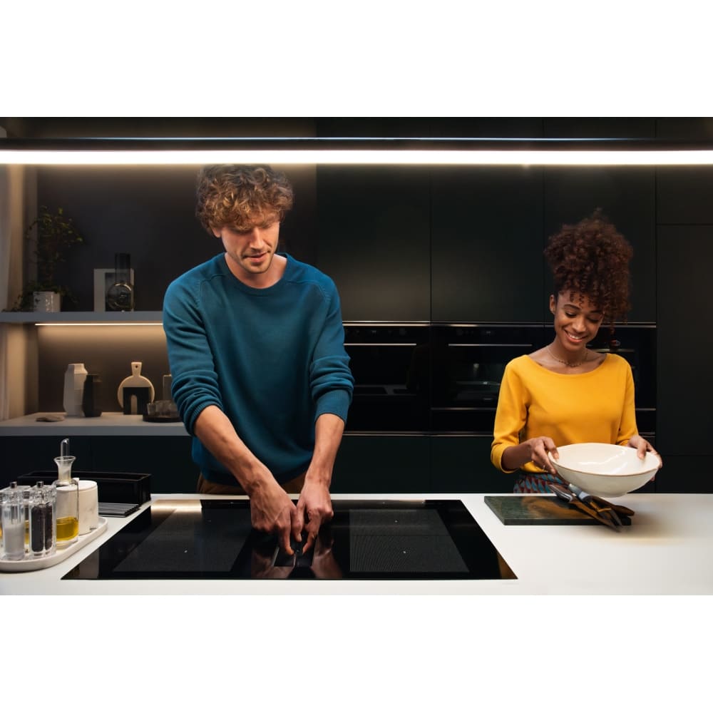 Варочная панель работает на индукционном нагреве — это значит, что повышается температура непосредственно посуды, в которой готовится блюдо. Таким образом промежуточная ступень с предварительным нагревом конфорки пропускается — сокращается время, повышается безопасность. Количество конфорок в этой модели: 4.