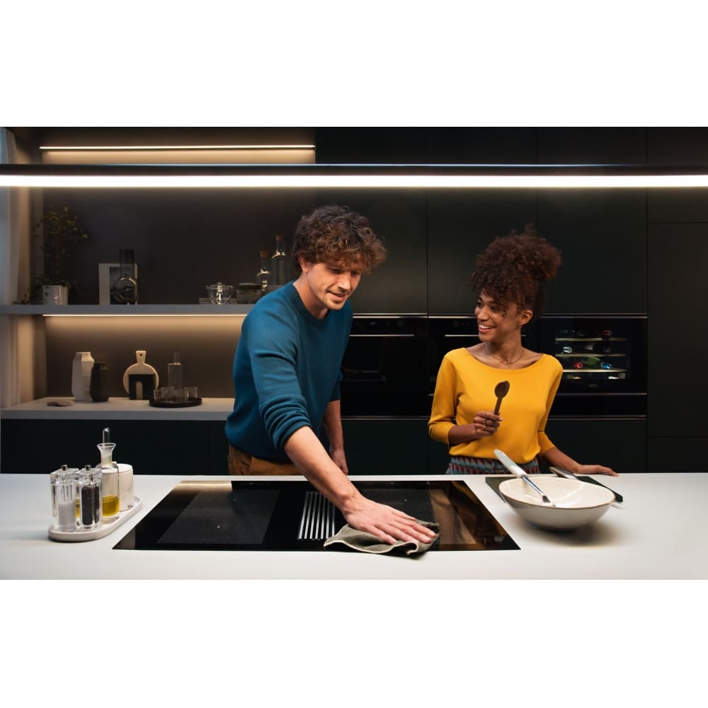 Вытяжка, встроенная в варочную панель — достаточно удобный вариант, позволяющий сэкономить место в кухне. Такая конструкция позволяет лучше улавливать испарения, не давая им распространяться по всему помещению, и способствует более качественной очистке воздуха. Большинство подобных моделей может работать только в режиме рециркуляции воздуха, с удалением капель жира, сажи, неприятных запахов при помощи системы фильтров. Работу в режиме отвода загрязненного воздуха через систему вентиляции организовать довольно сложно, поскольку вытяжка располагается низко над полом. Часто варочная панель находится на кухонном острове, что также мешает присоединению к вентиляции. Еще одна особенность подобных моделей состоит в том, что под варочной панелью нельзя разместить духовку или другую технику, так как место будет занято.