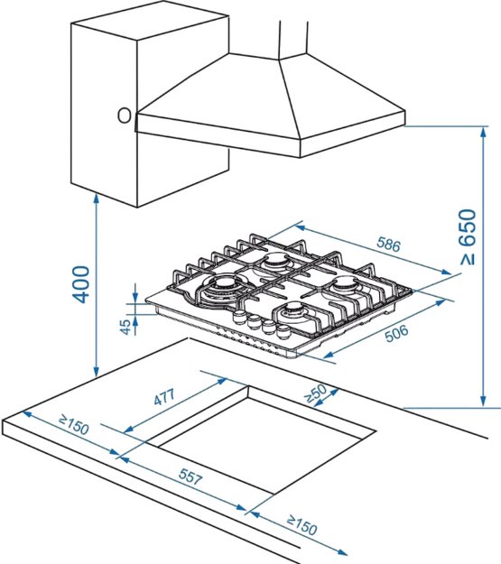 Устройство предназначено для независимой установки и подключается к газовой магистрали. Его габариты составляют 10,5×58,6×50,6 см, а размеры ниши для встраивания — 55,7×47,7 см, что обеспечивает простоту монтажа в стандартные кухонные модули. В упаковке изделие занимает 17×64×56,5 см, что удобно при транспортировке.