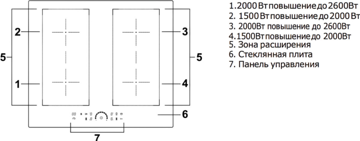 - Общая мощность конфорок: 7 кВт