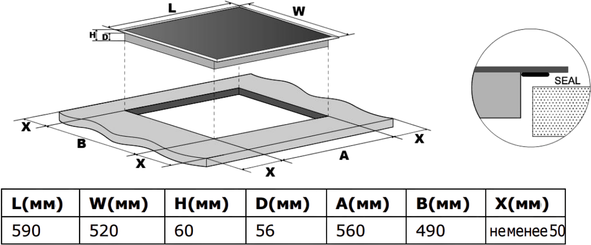 Устройство предназначено для независимой установки и подключается к электросети. Благодаря компактной высоте всего 5,5 см и размерам 59×52 см панель легко встраивается в стандартные кухонные модули. Рекомендуемые размеры ниши — 56×49 см, что обеспечивает плотное и аккуратное размещение без зазоров. В упаковке изделие занимает 11,5×65×56 см, что удобно при транспортировке.