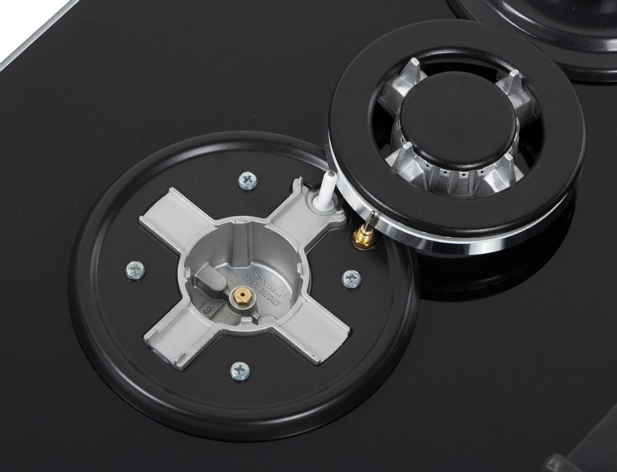 Выбор газовой варочной панели чаще всего обусловлен тем, что в частный дом или квартиру проведен именно газ в качестве обогрева. Работать с этой моделью довольно просто, так как мощность нагрева видна невооруженным взглядом — по силе огня в горелке. Количество конфорок в этой модели: 4. Горелки с двойной короной позволяют увеличивать мощность нагрева в зависимости от диаметра посуды.