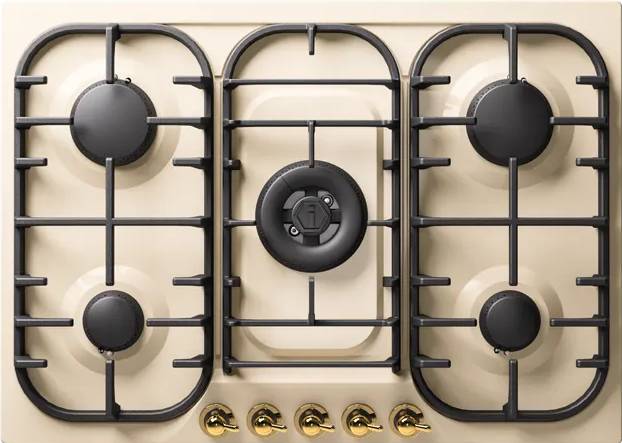 Выбор газовой варочной панели чаще всего обусловлен тем, что в частный дом или квартиру проведен именно газ в качестве обогрева. Работать с этой моделью довольно просто, так как мощность нагрева видна невооруженным взглядом — по силе огня в горелке. Количество конфорок в этой модели: 5. Горелки с тройной короной имеют несколько ступеней нагрева — в зависимости от них образуется несколько кругов пламени.