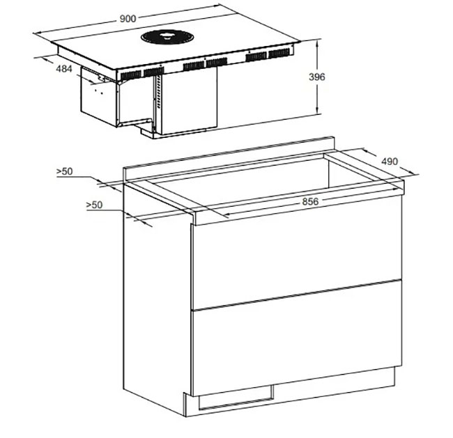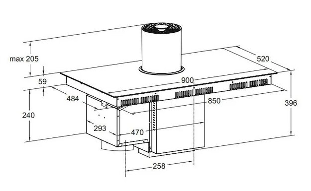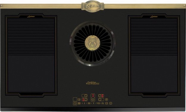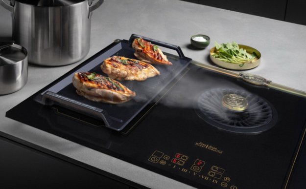 Вытяжка, встроенная в варочную панель — достаточно удобный вариант, позволяющий сэкономить место в кухне. Такая конструкция позволяет лучше улавливать испарения, не давая им распространяться по всему помещению, и способствует более качественной очистке воздуха. Большинство подобных моделей может работать только в режиме рециркуляции воздуха, с удалением капель жира, сажи, неприятных запахов при помощи системы фильтров. Работу в режиме отвода загрязненного воздуха через систему вентиляции организовать довольно сложно, поскольку вытяжка располагается низко над полом. Часто варочная панель находится на кухонном острове, что также мешает присоединению к вентиляции. Еще одна особенность подобных моделей состоит в том, что под варочной панелью нельзя разместить духовку или другую технику, так как место будет занято.