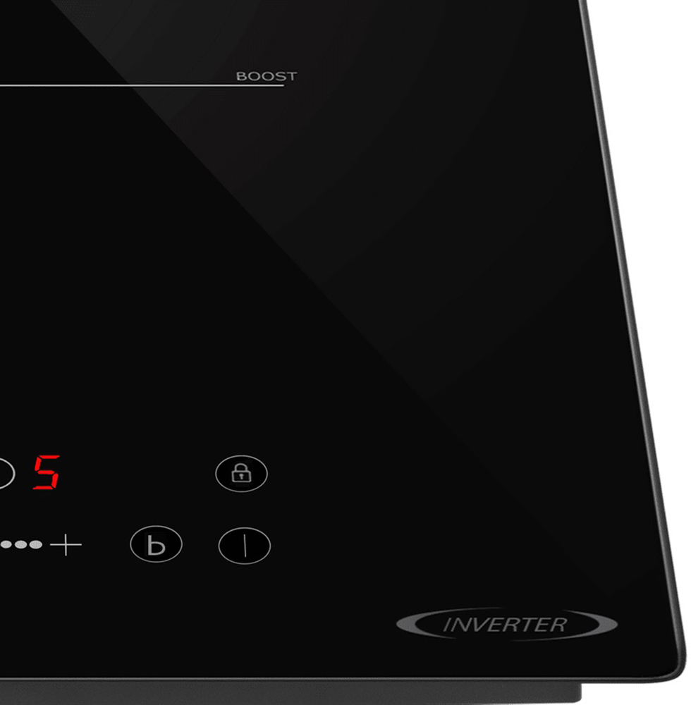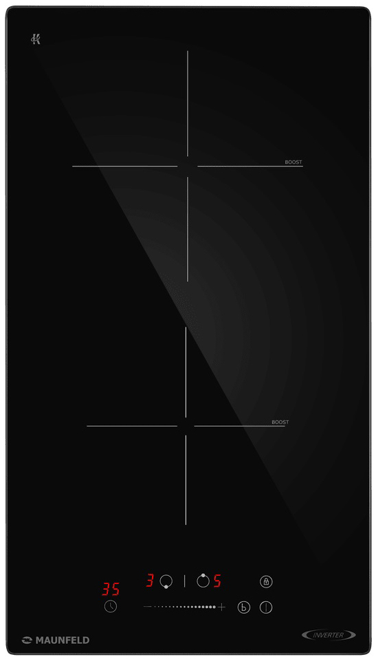 Варочная панель работает на индукционном нагреве — это значит, что повышается температура непосредственно посуды, в которой готовится блюдо. Таким образом промежуточная ступень с предварительным нагревом конфорки пропускается — сокращается время, повышается безопасность. Количество конфорок в этой модели: 2.
