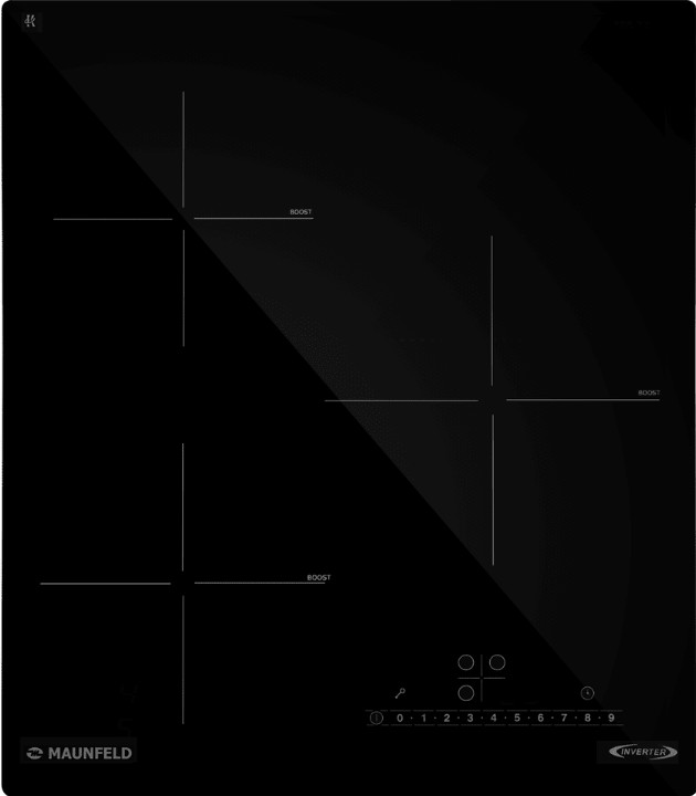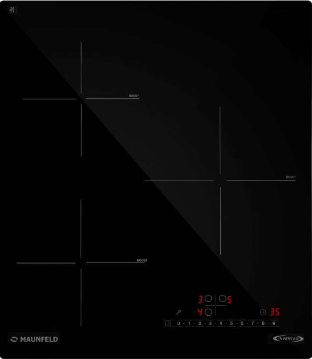 Варочная панель работает на индукционном нагреве — это значит, что повышается температура непосредственно посуды, в которой готовится блюдо. Таким образом промежуточная ступень с предварительным нагревом конфорки пропускается — сокращается время, повышается безопасность. Количество конфорок в этой модели: 3.