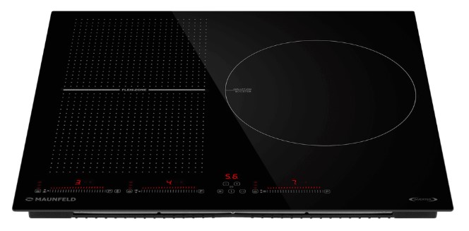 Варочная панель работает на индукционном нагреве — это значит, что повышается температура непосредственно посуды, в которой готовится блюдо. Таким образом промежуточная ступень с предварительным нагревом конфорки пропускается — сокращается время, повышается безопасность. Количество конфорок в этой модели: 3.