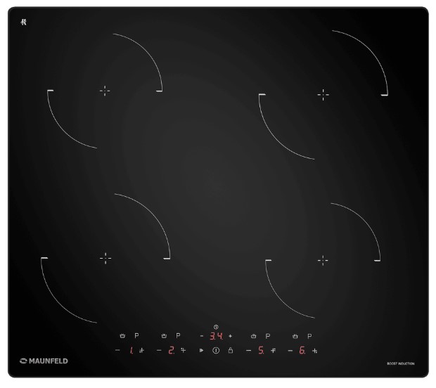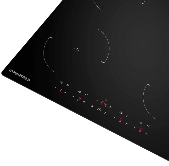Варочная панель работает на индукционном нагреве — это значит, что повышается температура непосредственно посуды, в которой готовится блюдо. Таким образом промежуточная ступень с предварительным нагревом конфорки пропускается — сокращается время, повышается безопасность. Количество конфорок в этой модели: 4.